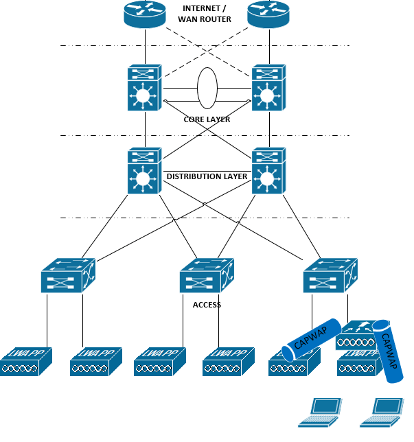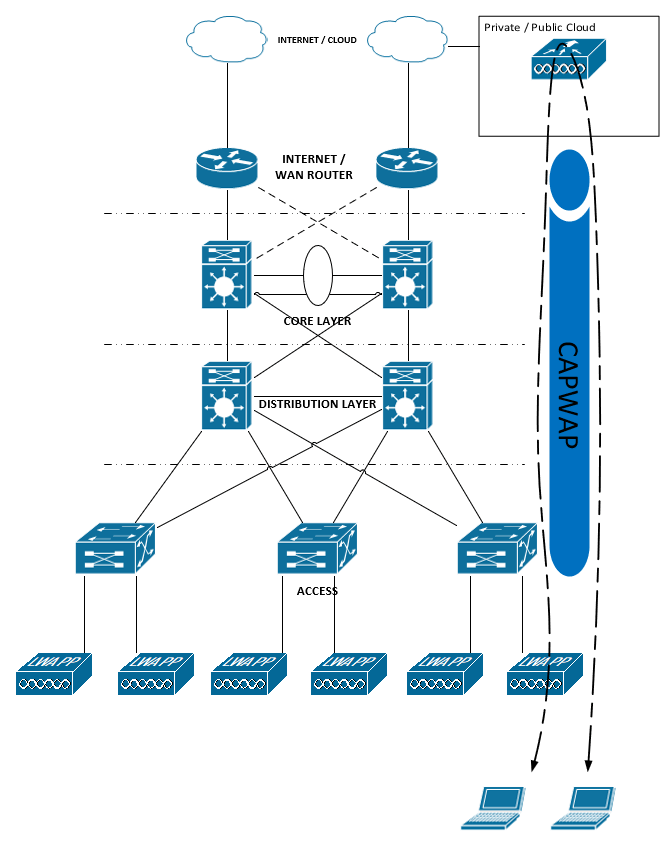 - CAPWAP tunnel between AP and WLC that is usually connected to Core Switch are used to carry multiple VLANs and WLANs.